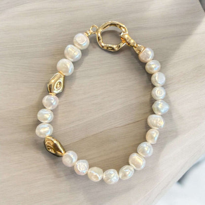 This freshwater Pearl armlet features real freshwater pearls, gold-filled pearls, and a stainless steel clasp. Its classic and elegant design complements our freshwater pearl necklace perfectly, making it a must-have accessory for any occasion. Elevate your look with the timeless beauty of this bracelet.