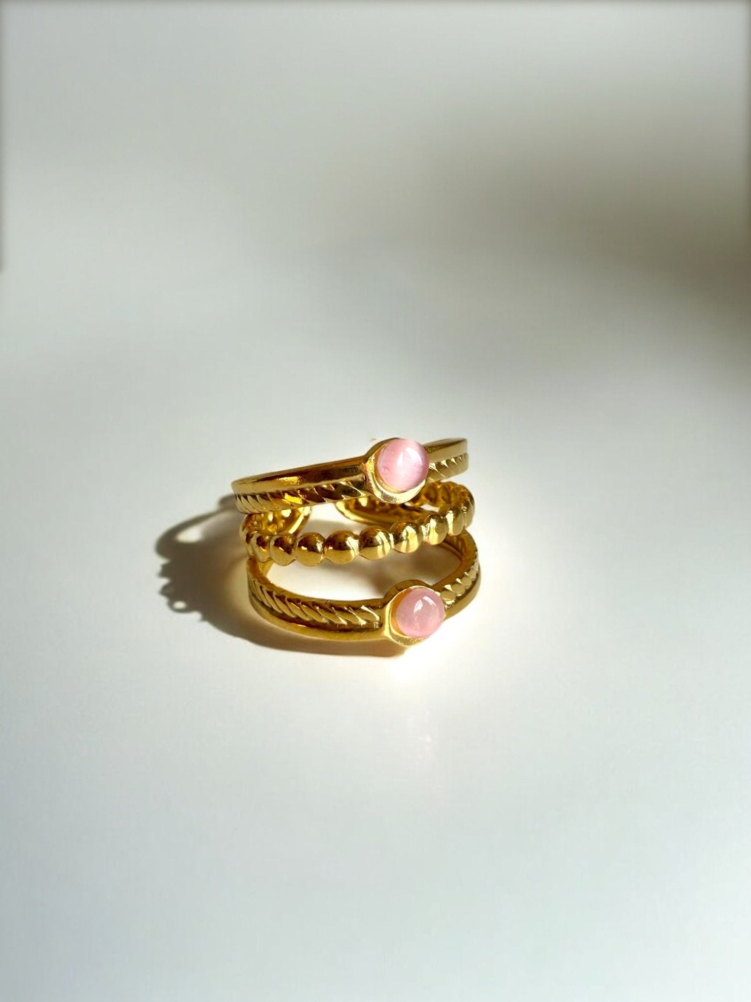 This Pink Cat Eye Ring features a genuine Pink Cat's Eye gemstone, celebrated for promoting clear judgment, intuition, and good fortune. Designed with adjustable 18k gold-filled stainless steel, it ensures a perfect fit while resisting tarnish, water, and allergens. Its soft pink glow adds a stylish, calming accent to any look, making it a trendy and meaningful addition to your jewelry collection.