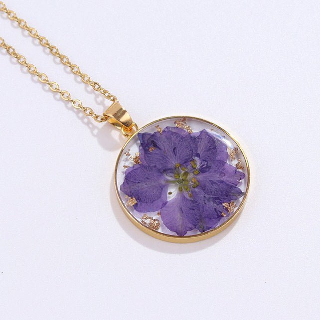 Add a touch of nature to your outfit with our Real Purple Flower Necklace. The pendant showcases a real flower enclosed in resin, ensuring each piece is one-of-a-kind. With 18k gold-filled and stainless steel, this necklace is both elegant and tarnish-free.